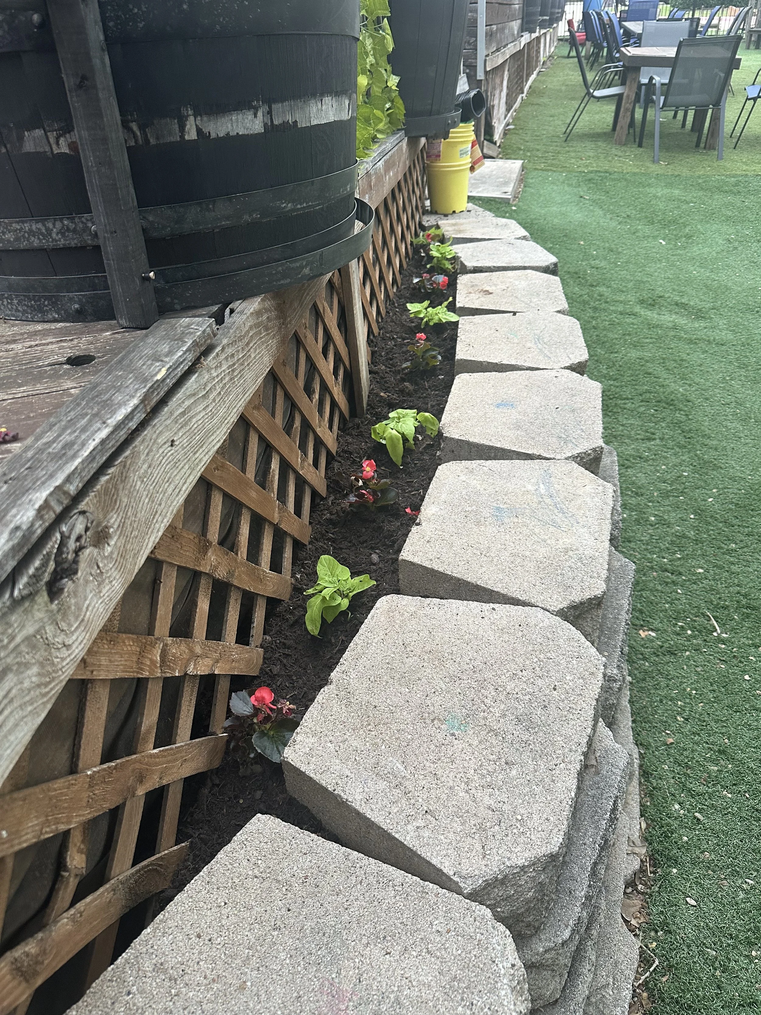 Custom flowerbed installations, raised planters, and semi-seasonal decorations.